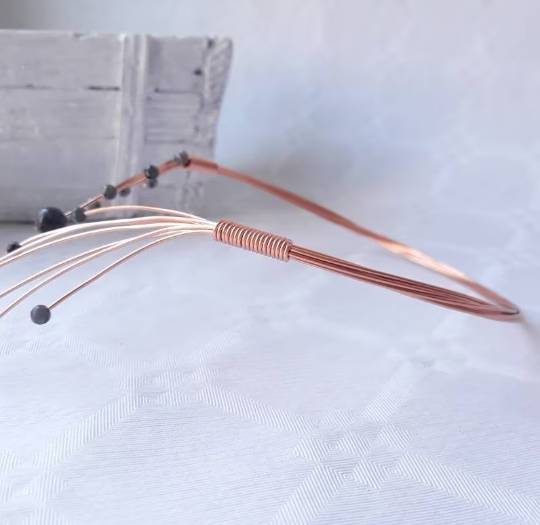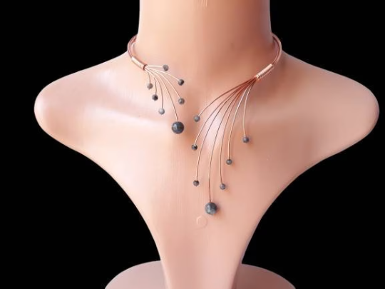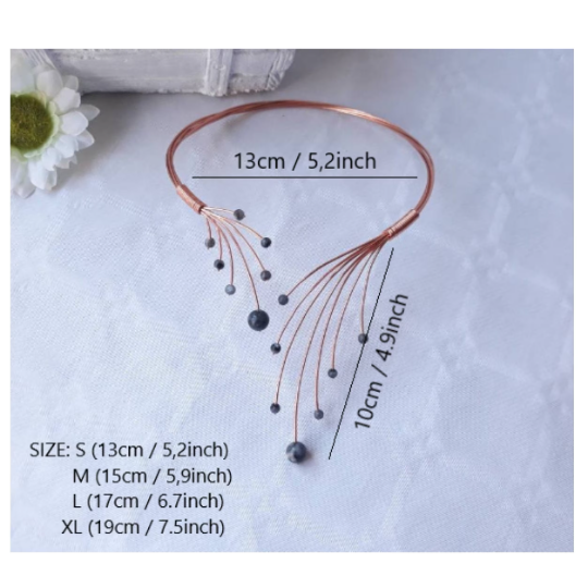 Art deco copper wire choker necklace with gray gemstones - Heady wire wrap with elegant fashion pair