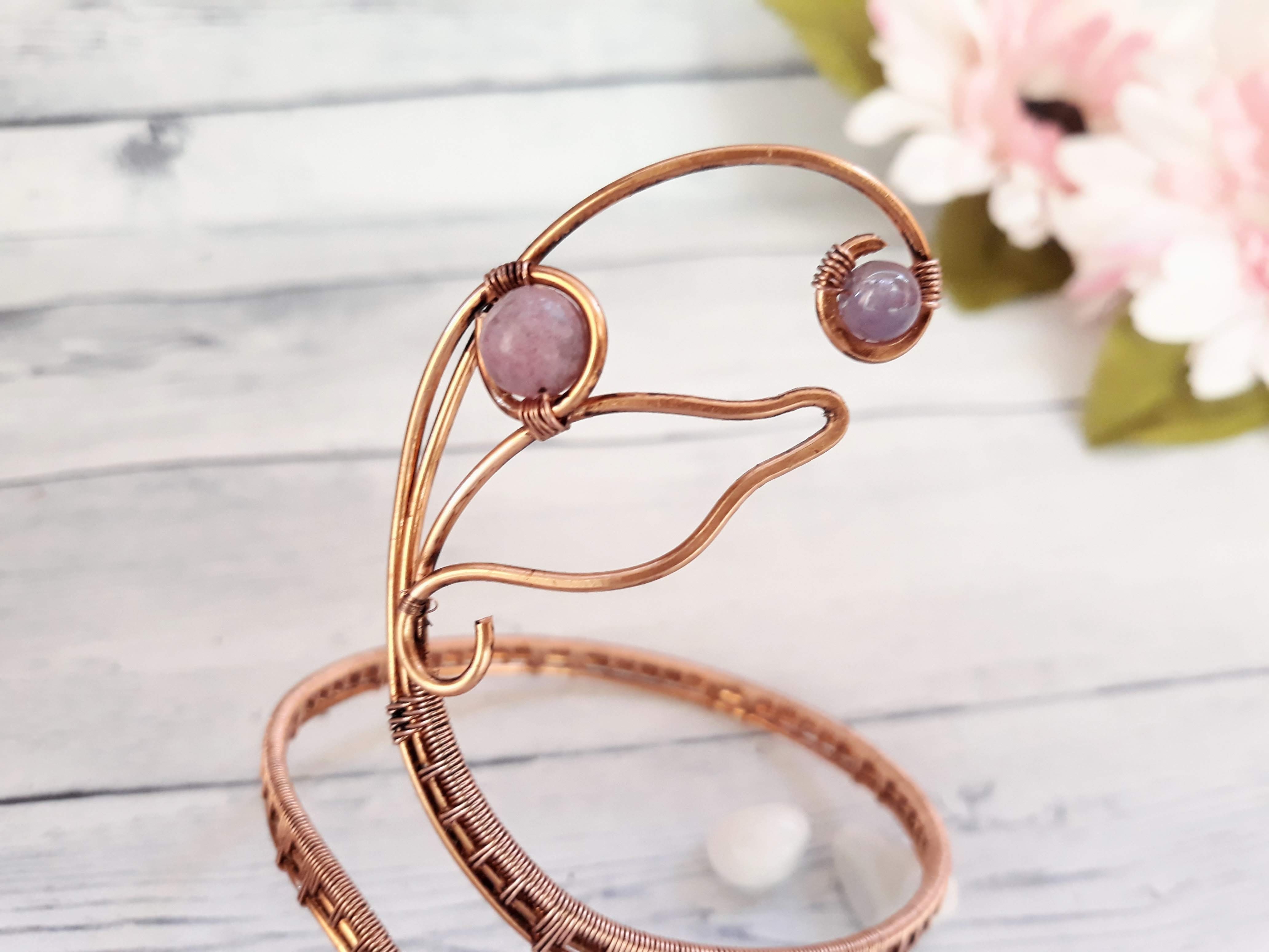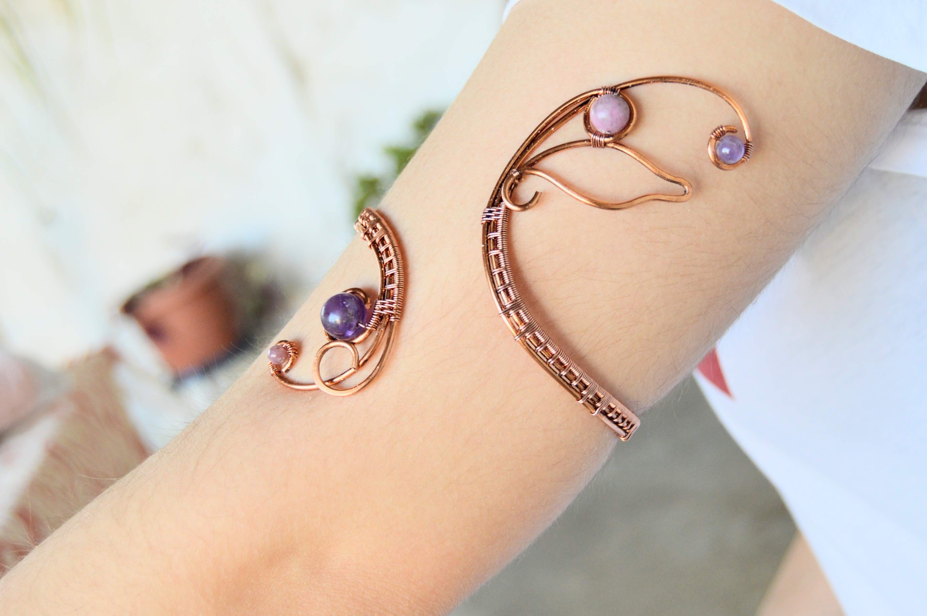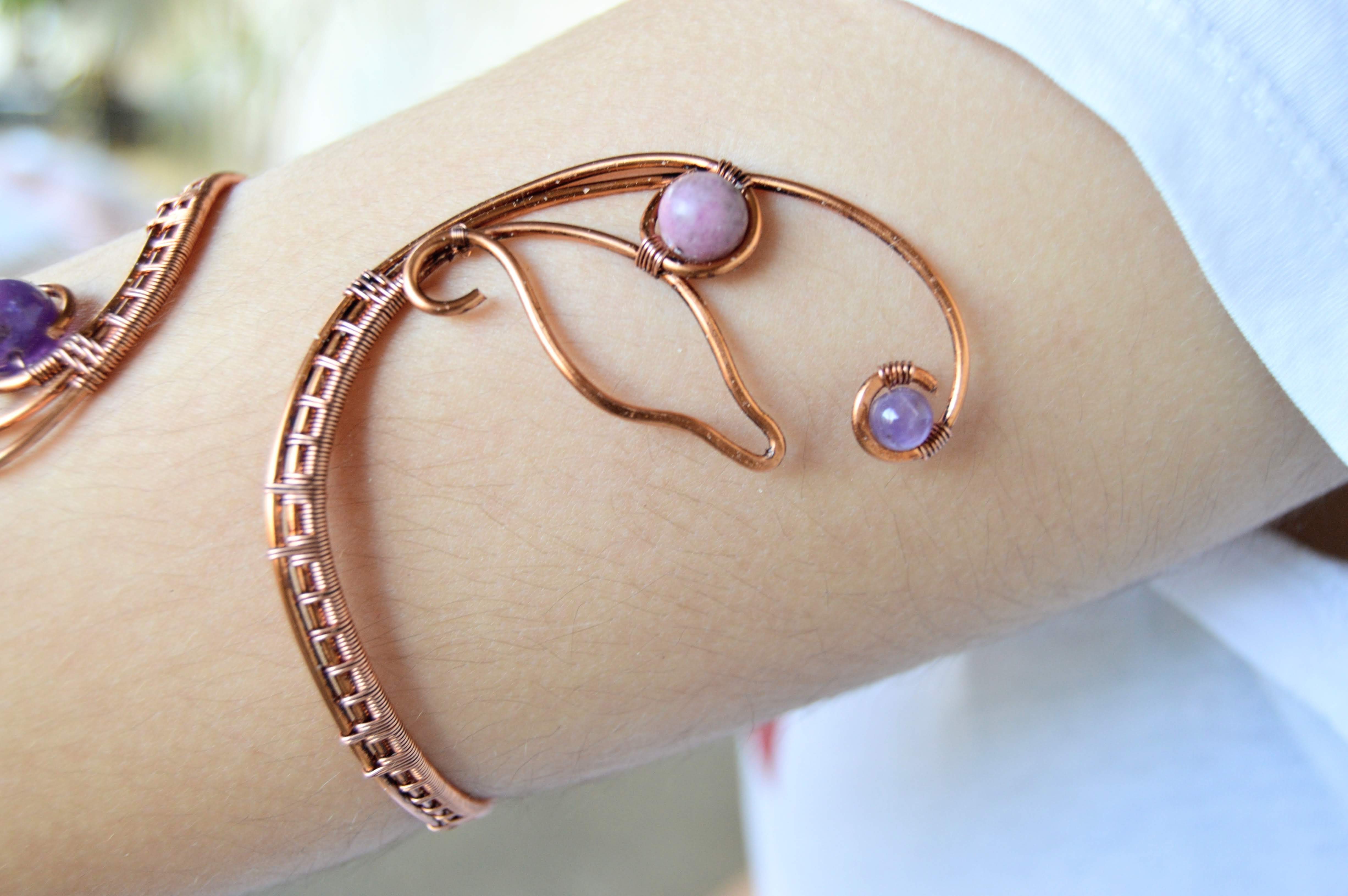 Purple Amethyst Upper Arm Cuff With Leaf And Filigree, Beaded Bangle Bracelet, Adjustable Copper Bracelets, Fashion Jewellery For Women