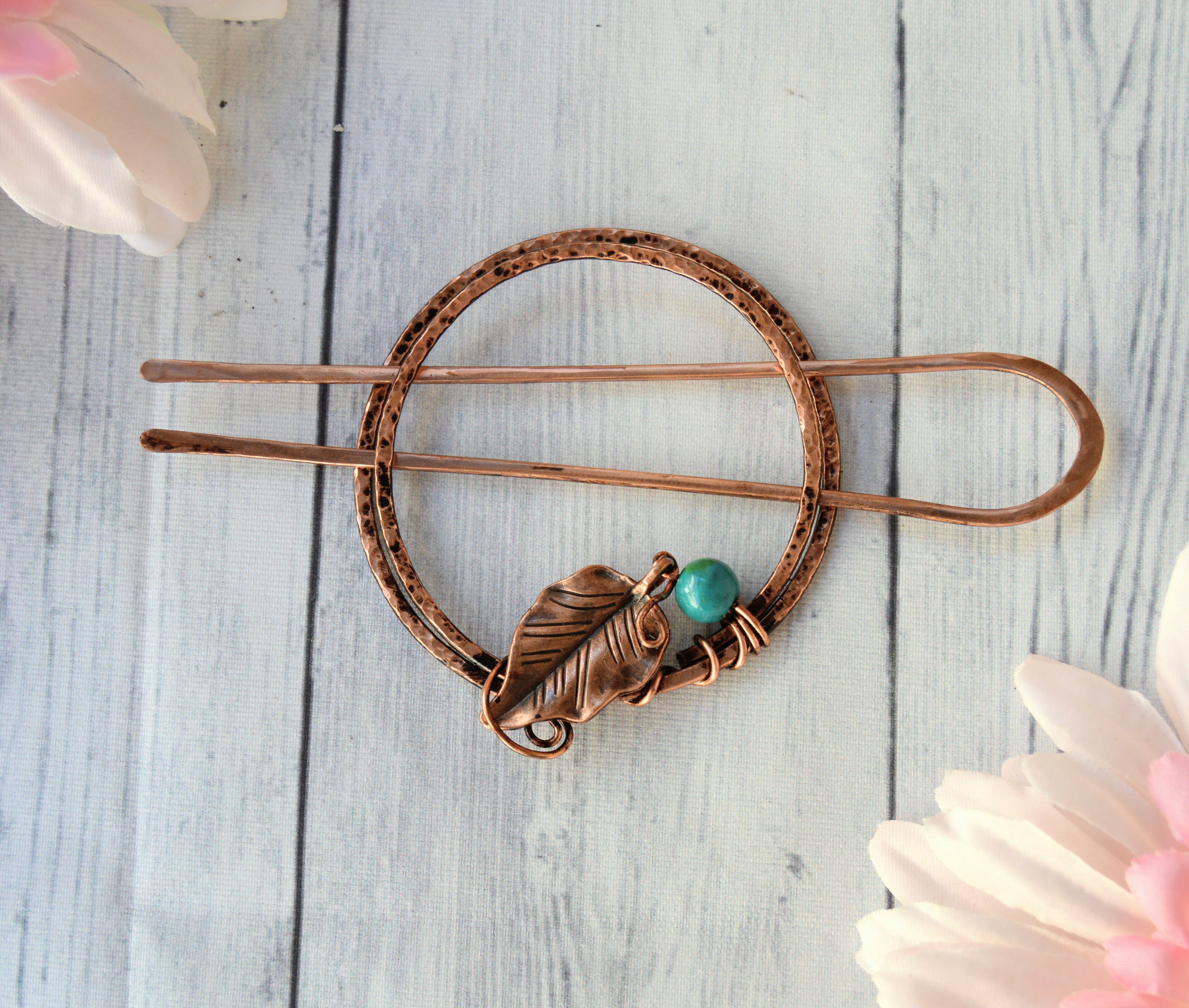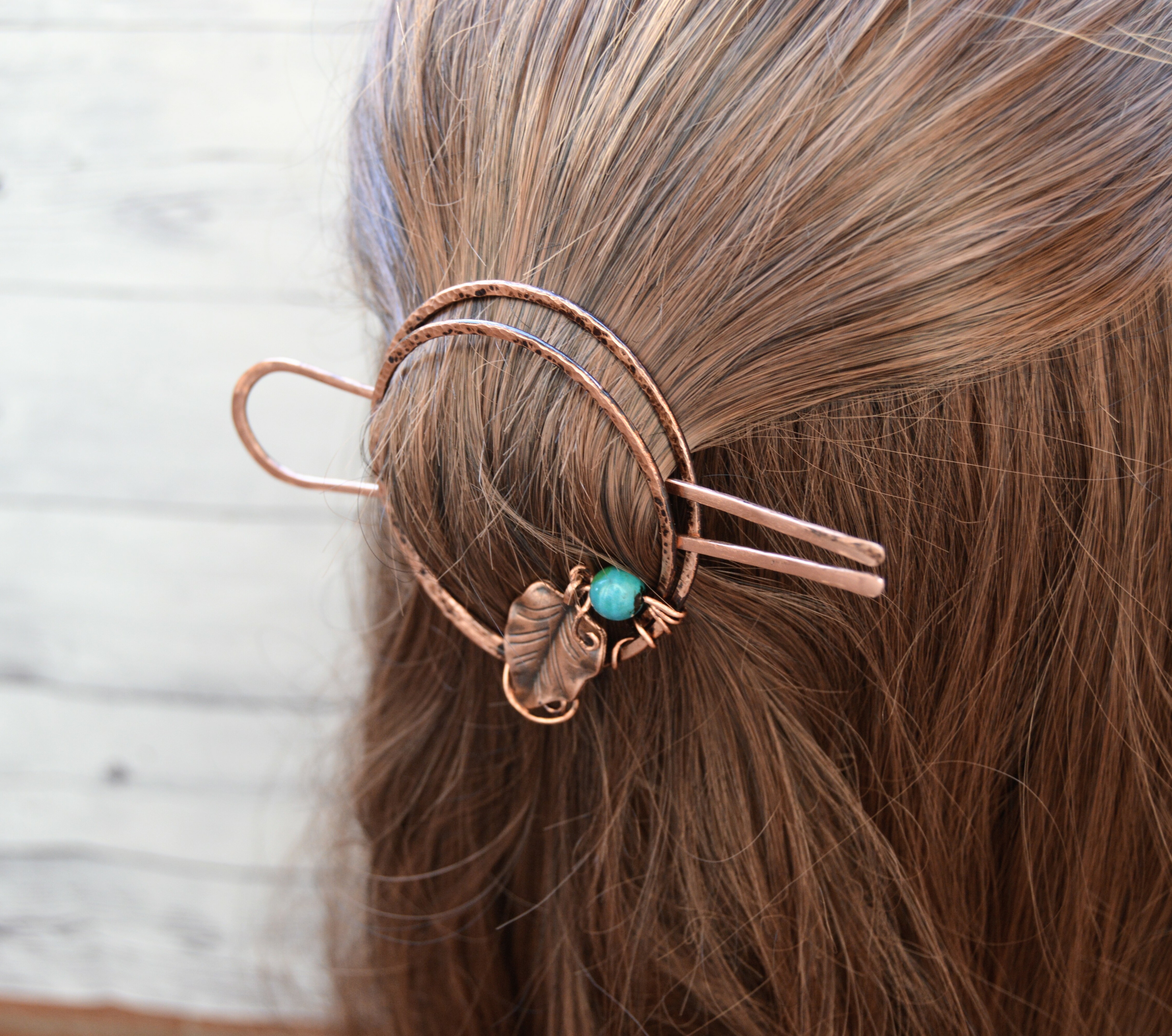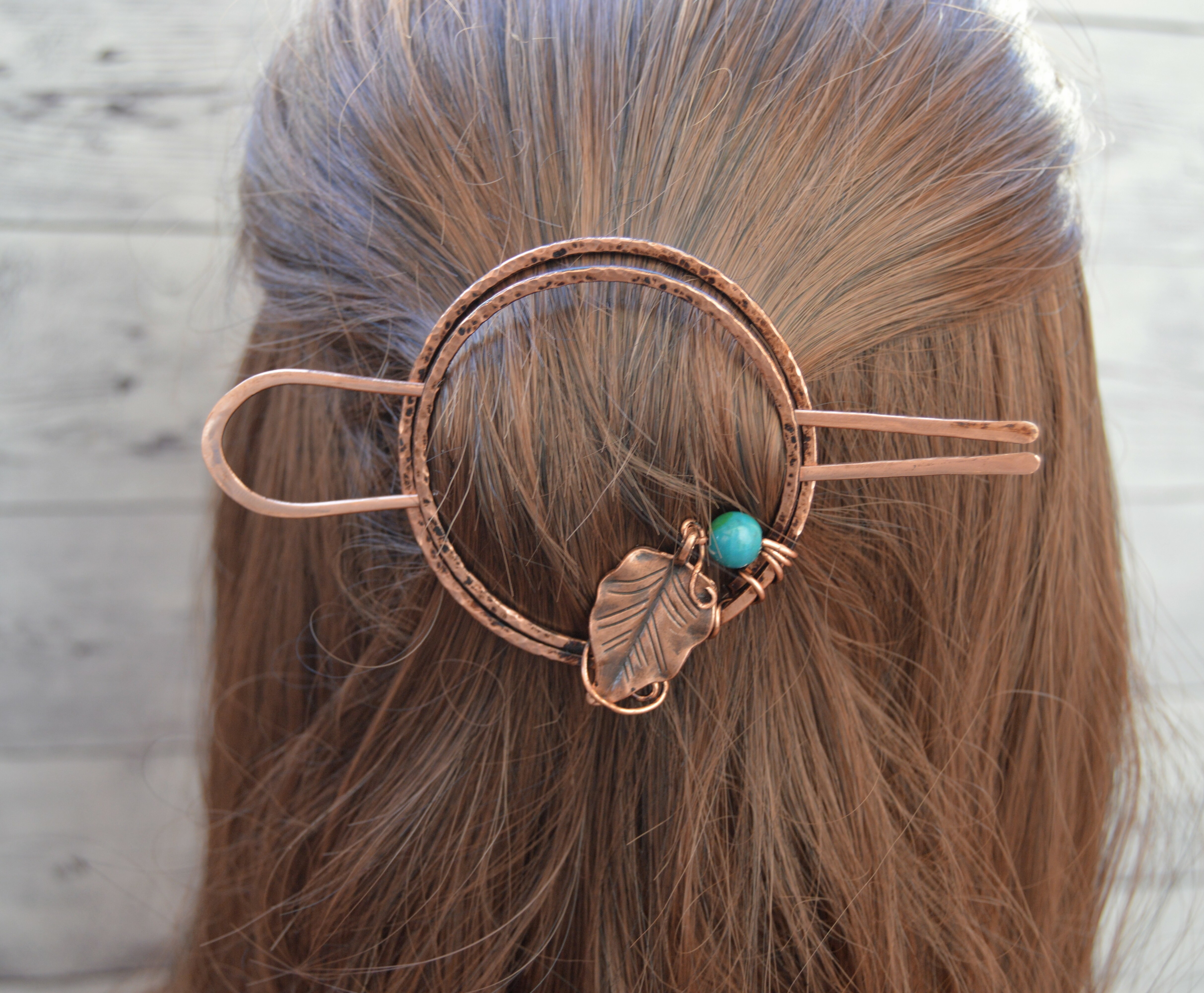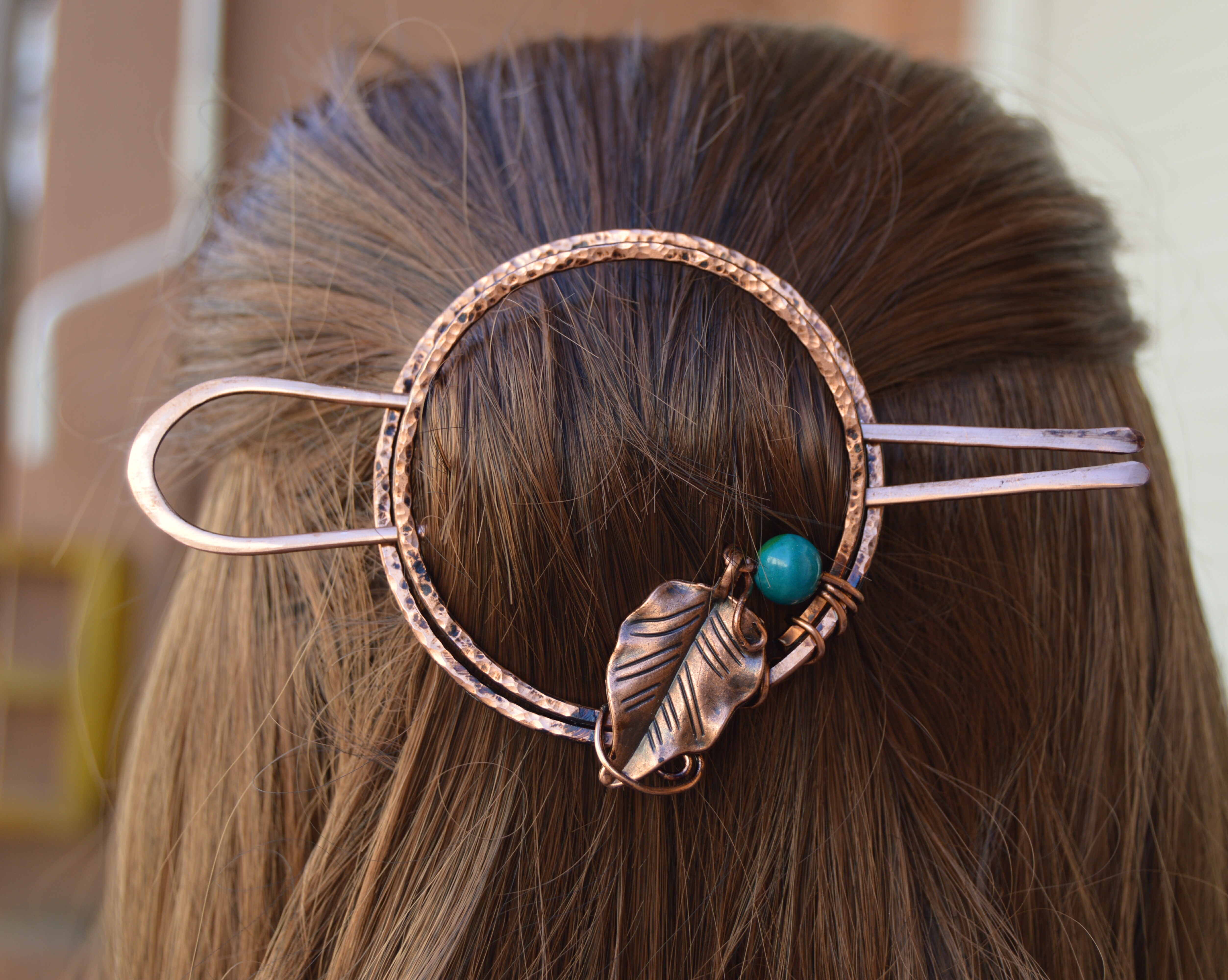 It is a simple hair accessory that I have only adorned with an oak leaf made of copper and an 8 mm chrysocolla bead.