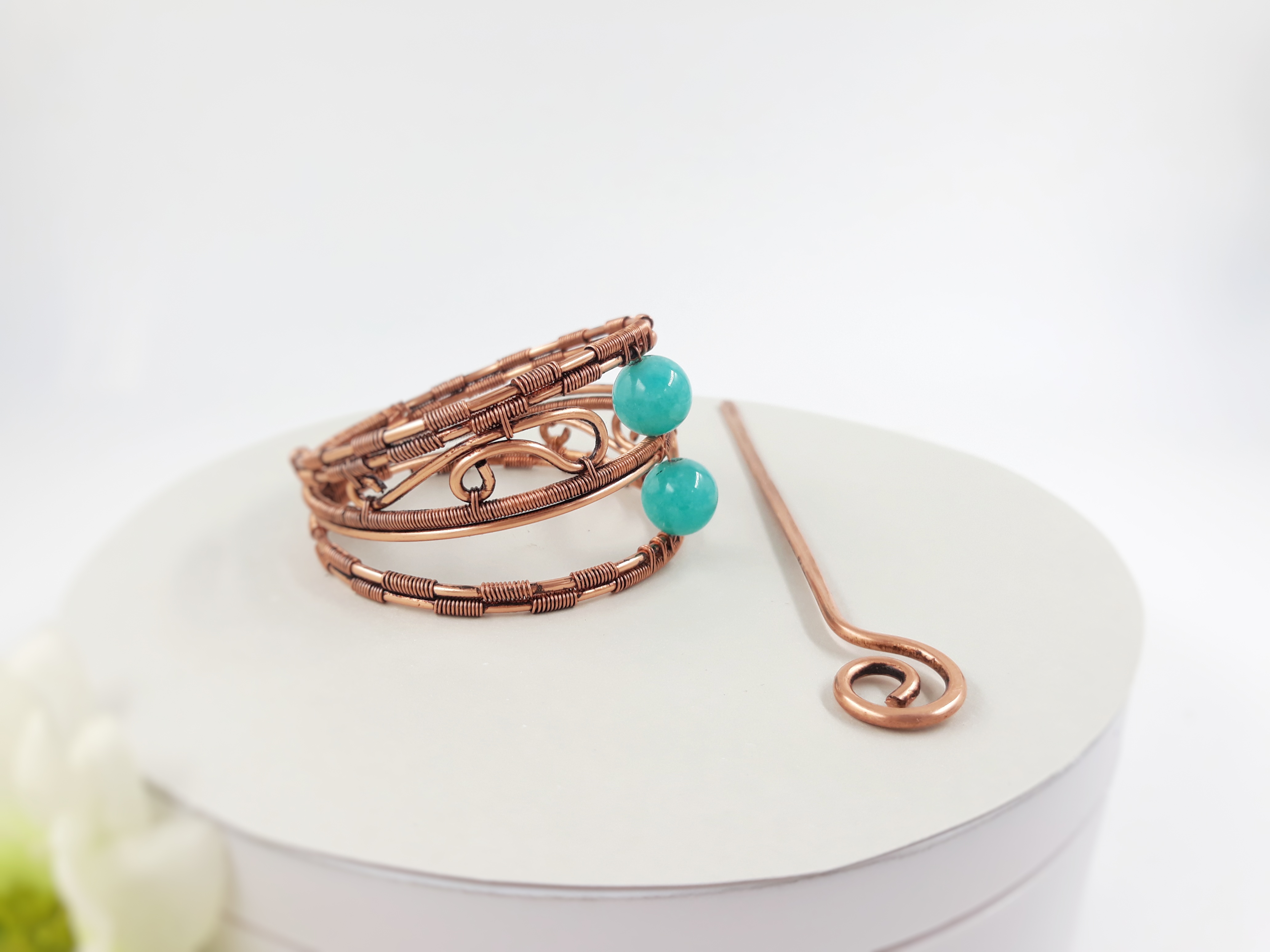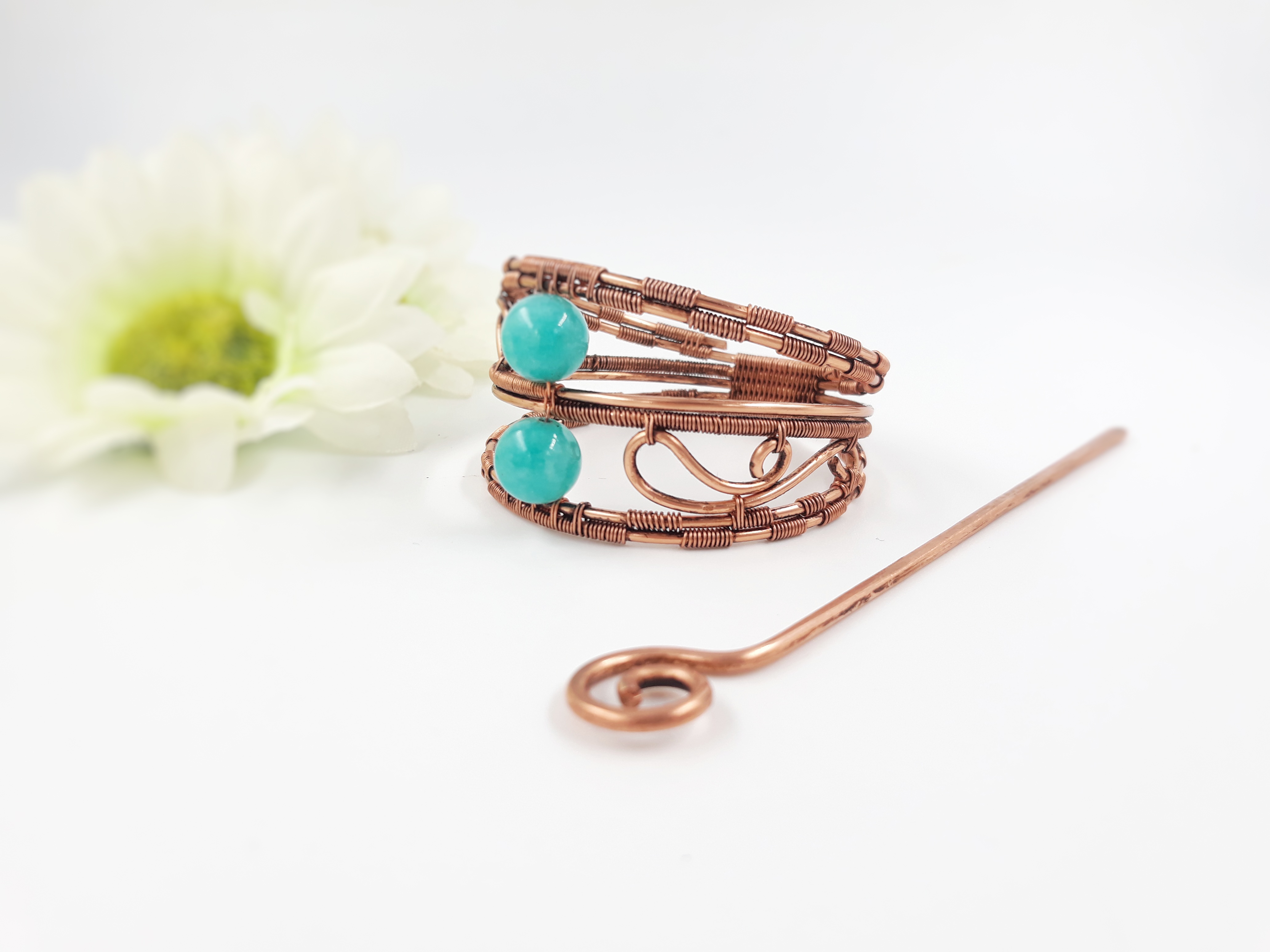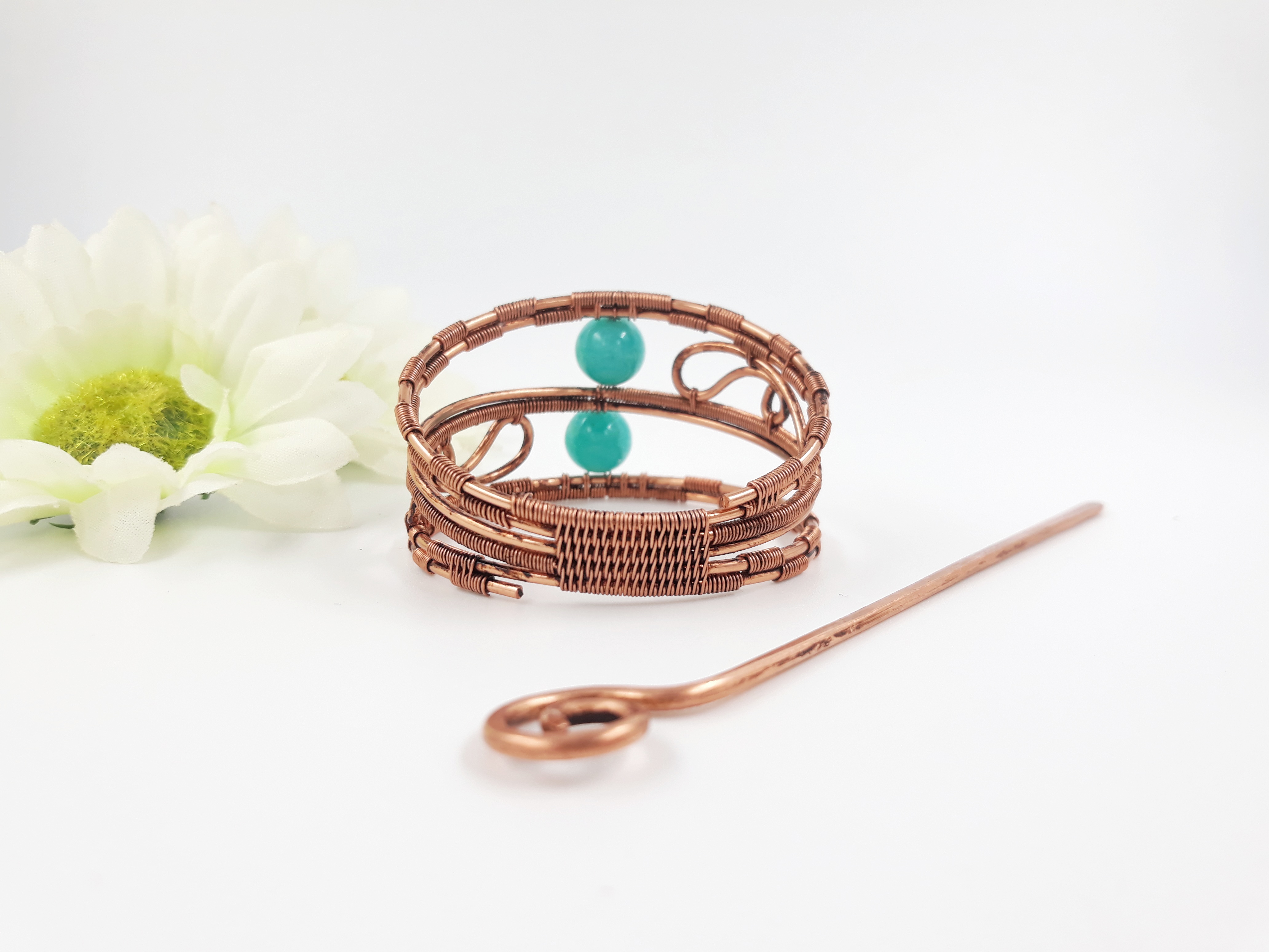 It has been made with copper wire that I have woven and aged with patina. The patina highlights the wrapping giving a vintage touch to the piece and makes the wrapping stand out.