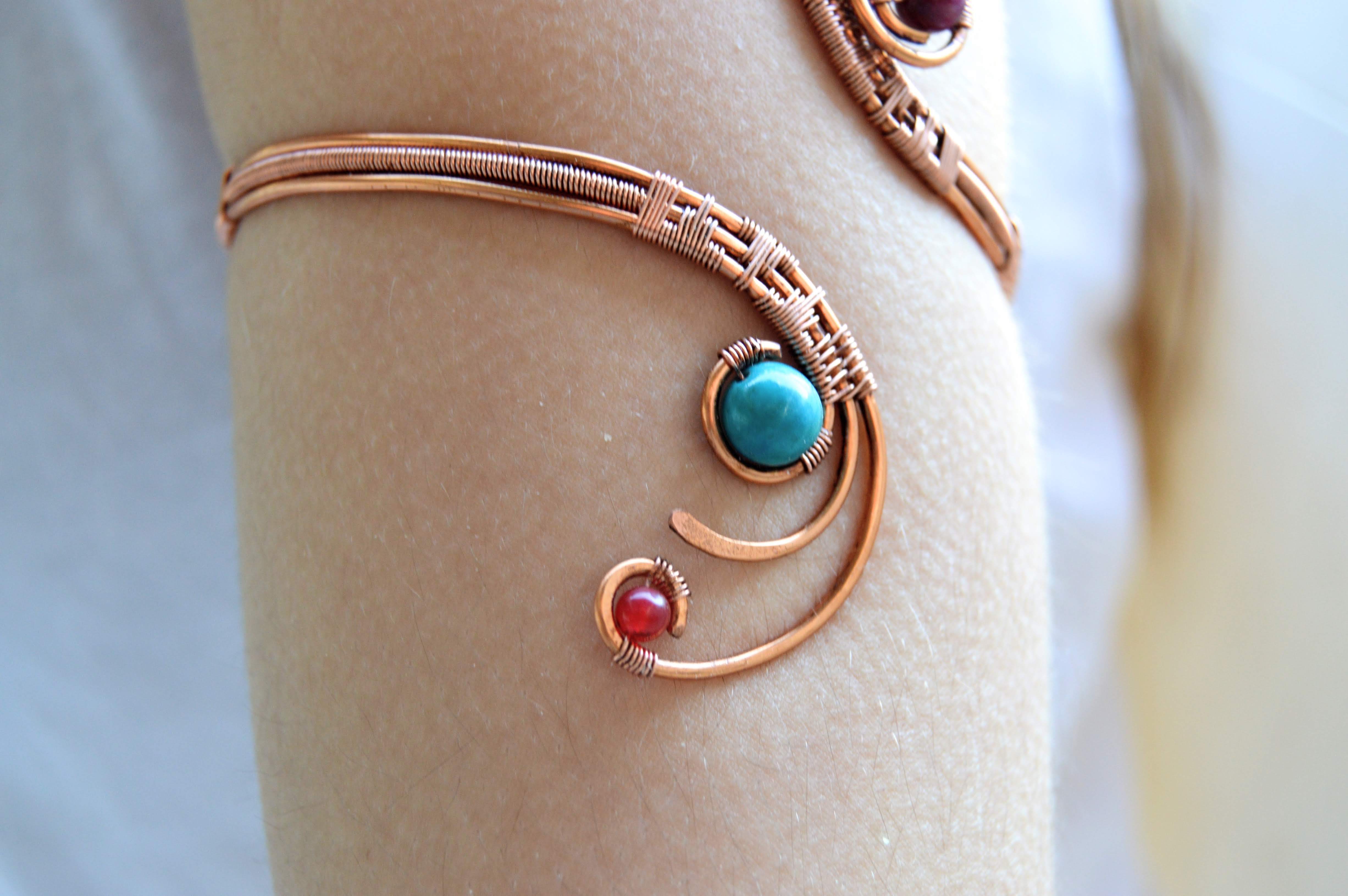 Upper Arm Cuff Copper Wire With Red Carnelian and Blue Chalcedony