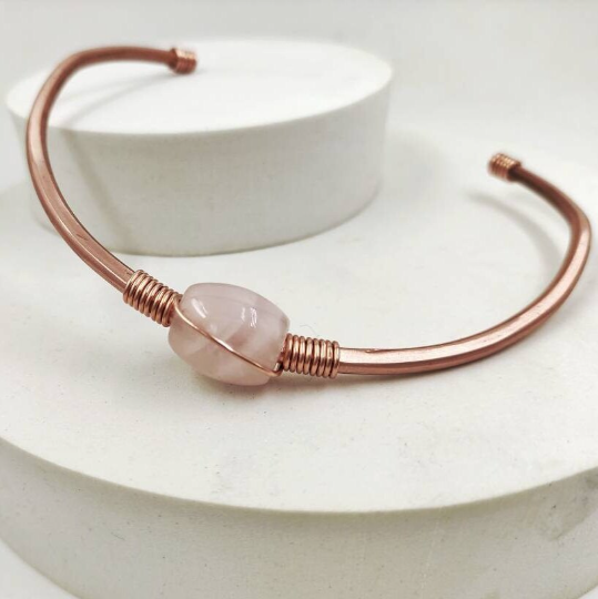 Torque necklace with rose quartz stone, copper choker for women, wire wrap rigid necklace gift for her