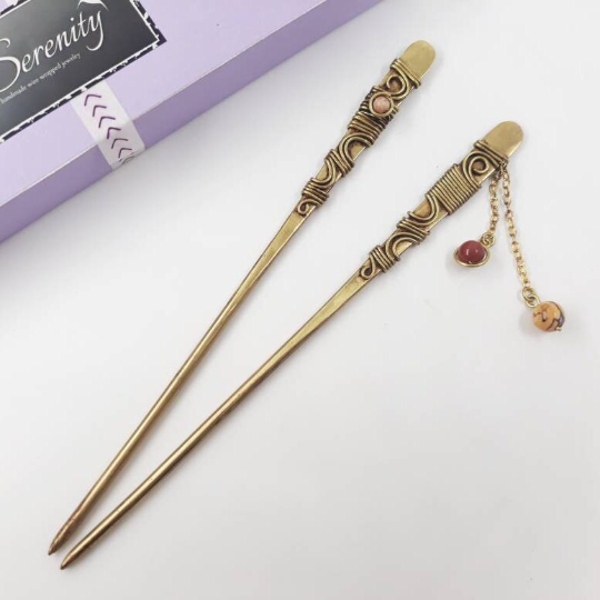 Golden hair sticks with mookaite jasper set, brass wire hair fork, set of 2 metal hair slide