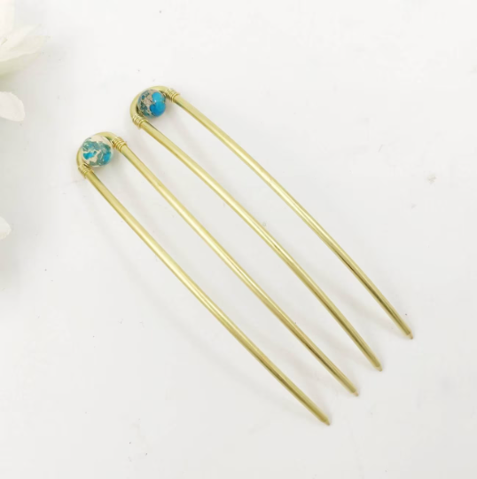 It consists of two 10 cm long U-shaped hair rods adorned with an 8 mm natural stone bead that can be customized.