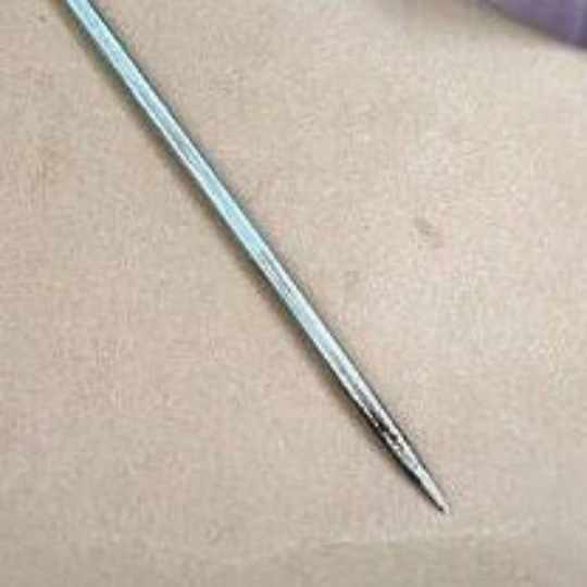 The lower end has a pointed shape and has been filed and polished so that the hairpin glides smoothly through the hair without damaging it.