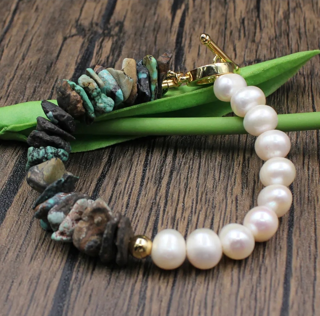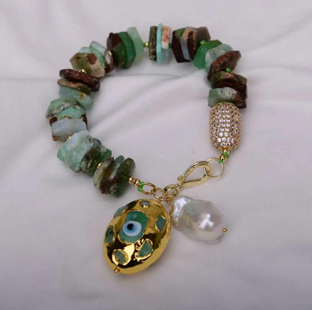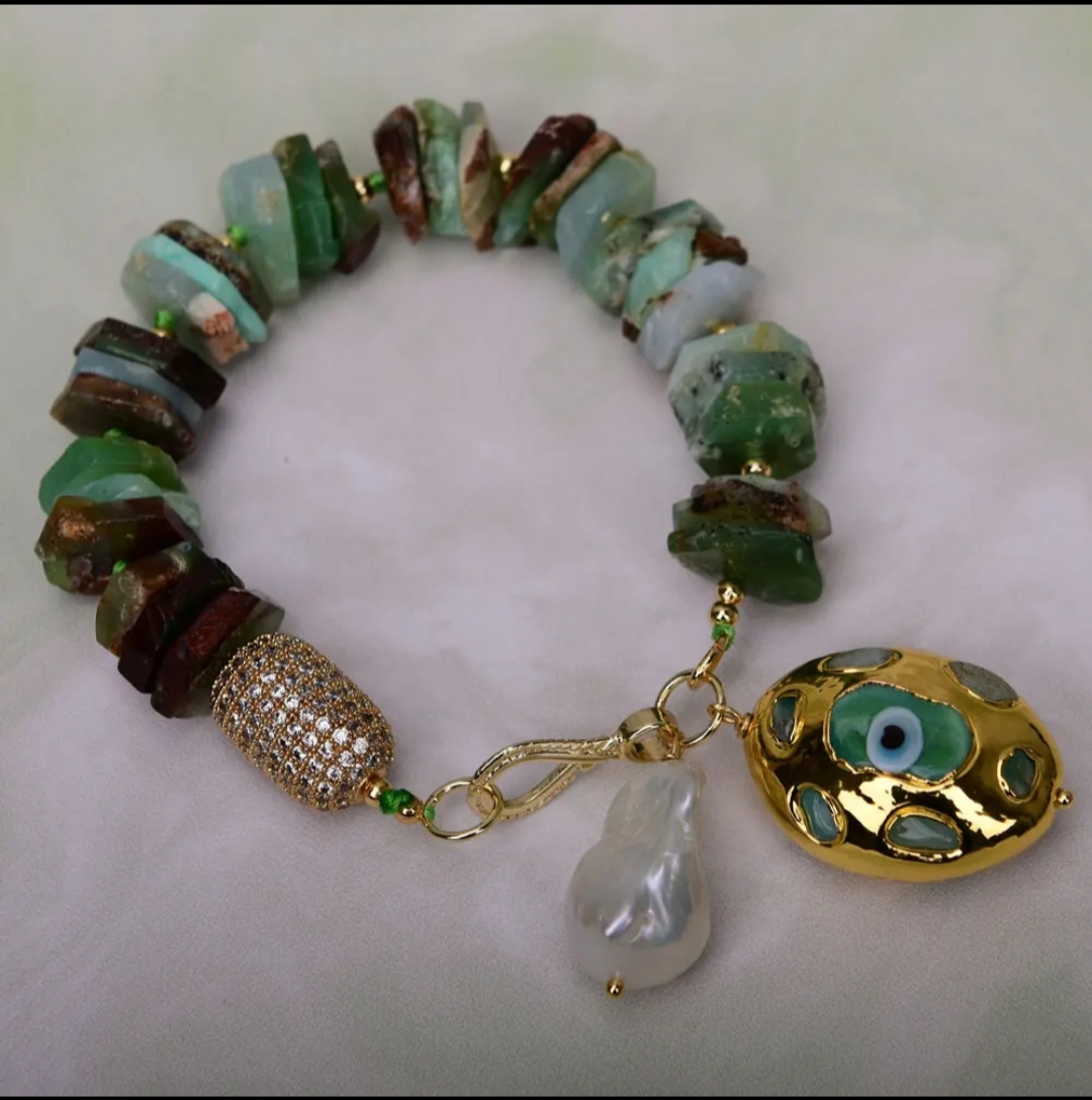 They have been made with wrapped copper wire and I have embellished them with Chinese jade beads of different sizes.